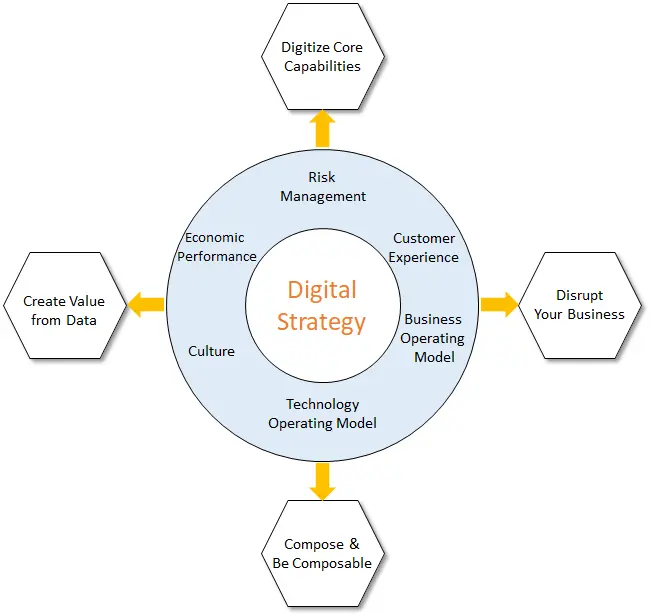另外,为了与数字化世界的速度和规模相匹配,企业在设计其业务和技术运营模式时需要考虑到互连性和互操作性。他们必须参与到更广泛的数字化生态系统中,让第三方供应商能够开发出可随意组合产品和服务的可组合模型。最后,如Thomas H. Davenport在其题为“竞争分析”的开创性论文中所解释的,为了实现数字化,必须收集内部和外部数据,以便在分析上展开竞争并创造商业价值。