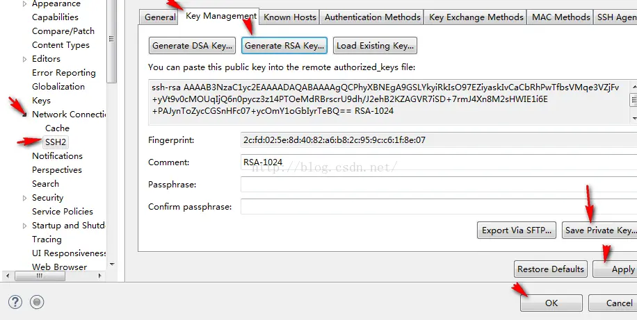 2.eclipse生成SSH2 key:windows -- perferences--General--Network Commection--SSH2--key management--General RSA Key