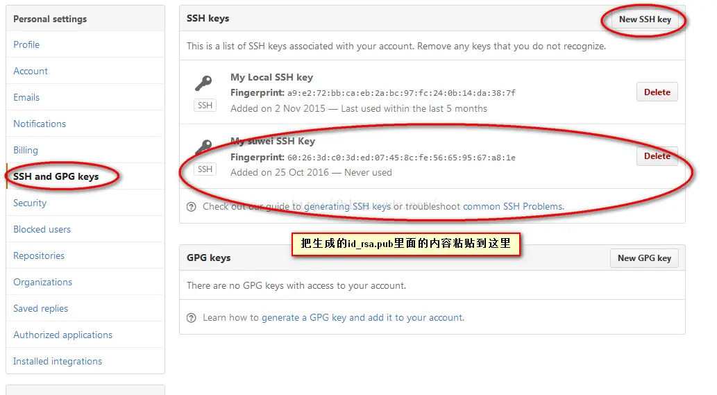 然后把生成的公钥粘贴到github上:(该步不能省略,一定要用命令检查下生成的公钥是否正常)