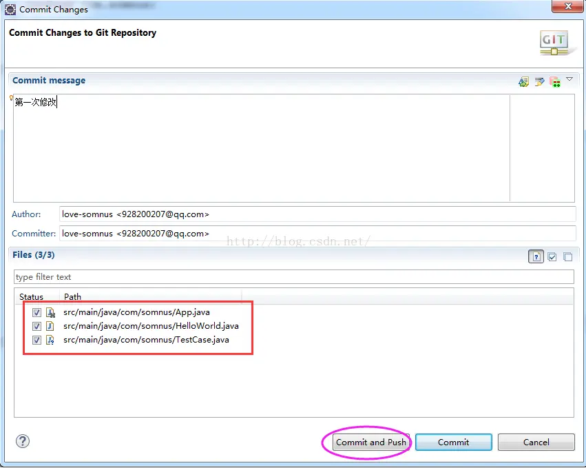 点击“commit and push”表示提交并推送,即把修改的文件提交至本地,推送到远程仓库。