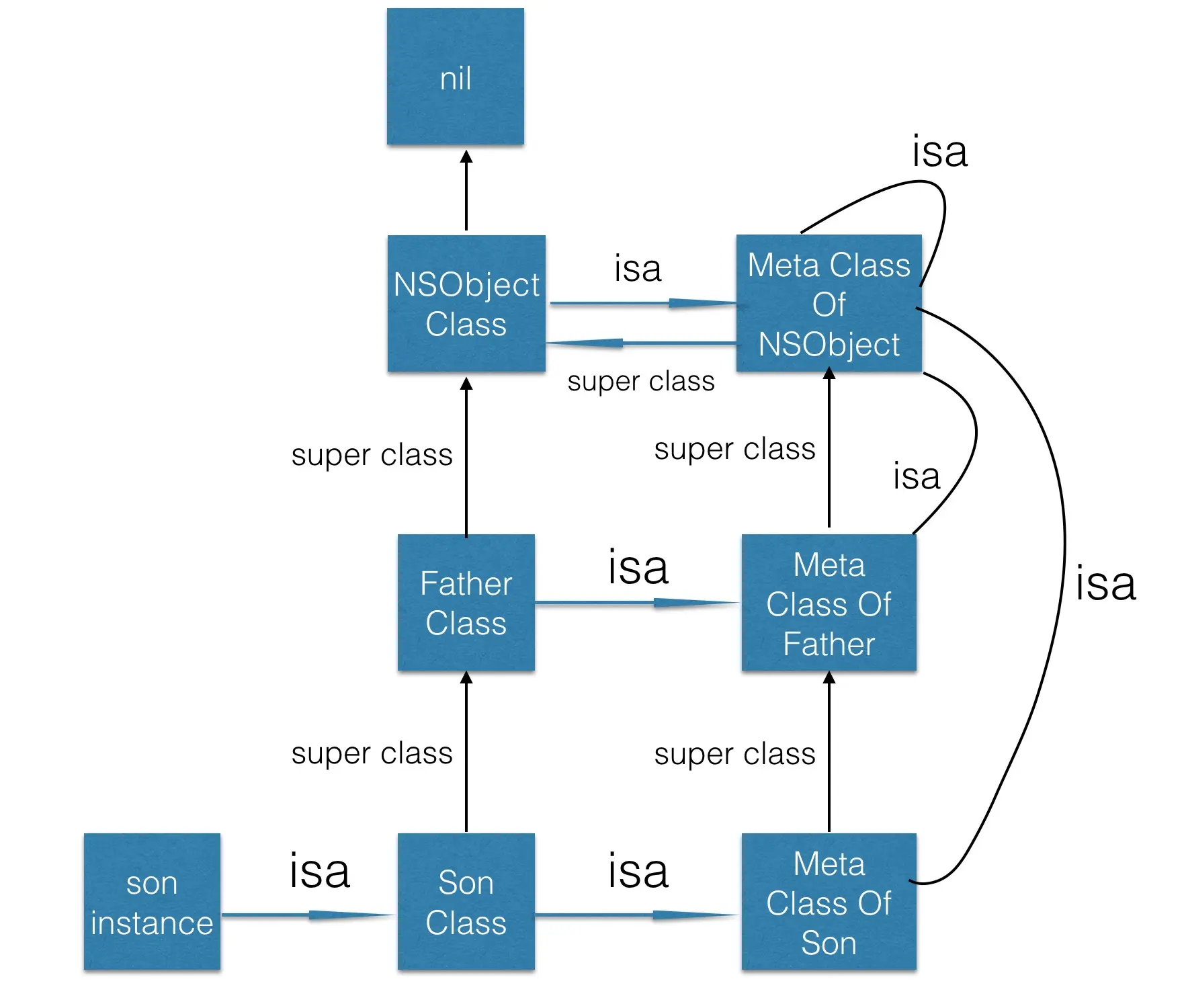 Son->(isa)MetaClassOfSon->(superClass)MetaClassOfFather->(superClass)MetaClassOfNSObjetc->(superClass)NSObject->(superClass)nil