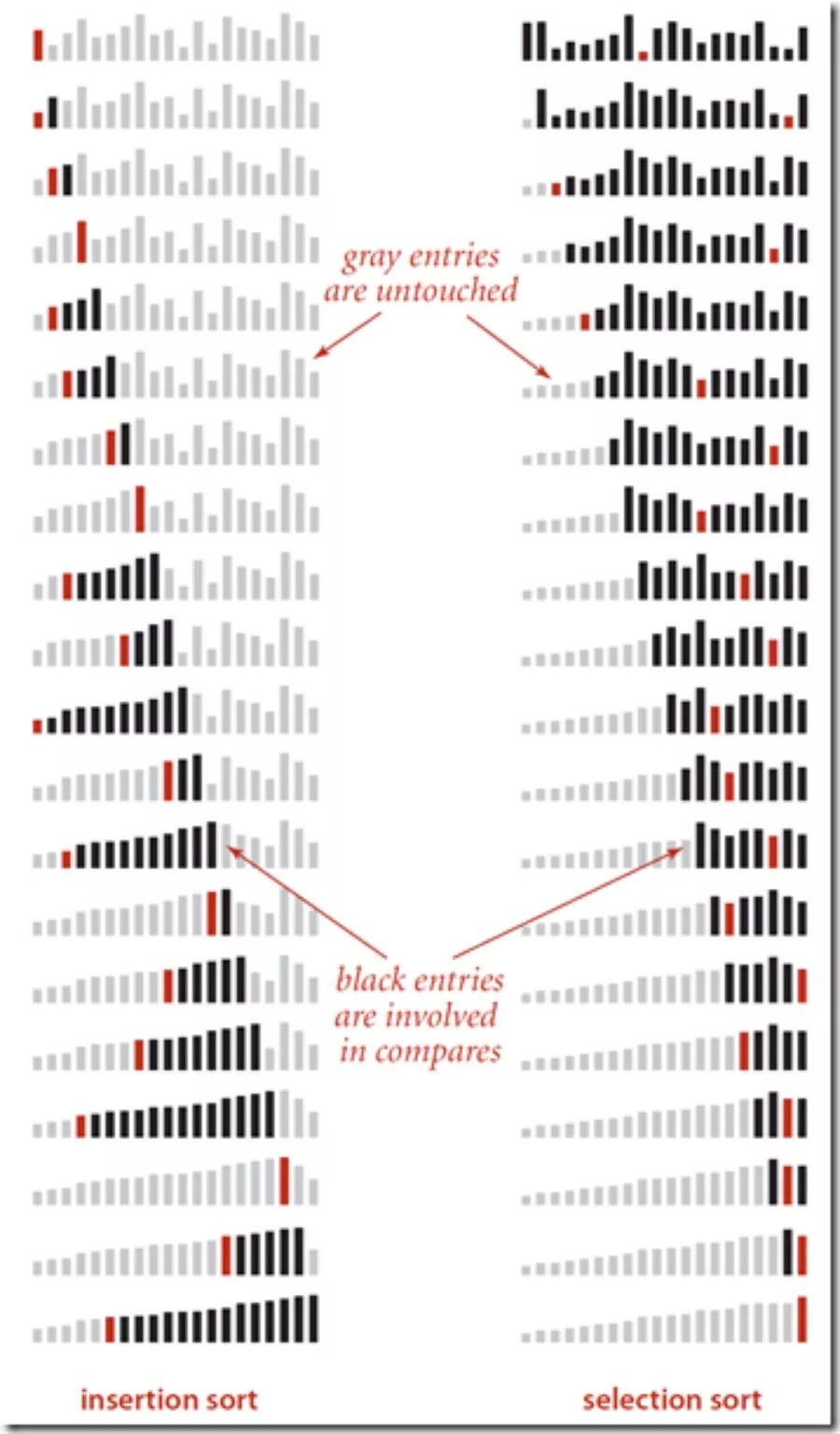 上图展示了插入排序和选择排序的动画效果。图中灰色的柱子是不用动的,黑色的是需要参与到比较中的,红色的是参与交换的。图中可以看出: