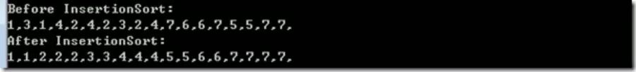 Int32[] array1 = new Int32[] { 1, 3, 1, 4, 2, 4, 2, 3, 2, 4, 7, 6, 6, 7, 5, 5, 7, 7 };Console.WriteLine("Before InsertionSort:");PrintArray(array1);Sort<Int32>.InsertionSort(array1);Console.WriteLine("After InsertionSort:");PrintArray(array1);Console.ReadKey();