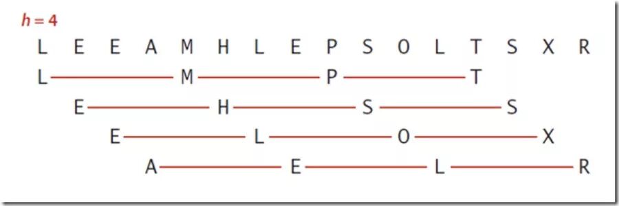 如下图,我们对下面数组进行排序的时候,首先以4为步长,这是元素分为了LMPT,EHSS,ELOX,AELR几个序列,我们对这几个独立的序列进行插入排序,排序完成之后,我们减小步长继续排序,最后直到步长为1,步长为1即为一般的插入排序,他保证了元素一定会被排序。