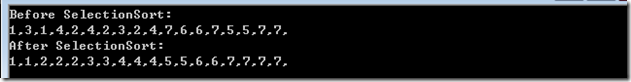 static void Main(string[] args){ Int32[] array = new Int32[] { 1, 3, 1, 4, 2, 4, 2, 3, 2, 4, 7, 6, 6, 7, 5, 5, 7, 7 }; Console.WriteLine("Before SelectionSort:"); PrintArray(array); Sort<Int32>.SelectionSort(array); Console.WriteLine("After SelectionSort:"); PrintArray(array); Console.ReadKey();}