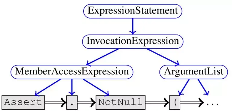 句法边缘包括简单的“NextToken”边,用于表示抽象语法树的“Child”边,和用于将源代码与源代码文本中最后一次发生连接的“LastLexicalUse”边。图 1 以语句 Assert.NotNull(clazz)为例展示了这种边,其中与 token 对应的节点是灰色框,与程序语法的非终端对应的节点是蓝色椭圆。子边缘显示为蓝色实心边缘,而 NextToken 边缘为黑色双边缘。