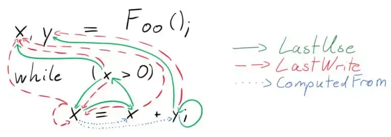 LastUse 关系以绿色边缘显示。因此,例如,y 与循环之前的 y 的最后一次使用以及自身相关联。同样,LastWrite 关系显示为红色边,因此在 while 条件中使用 x 与循环前的 x 赋值,以及循环内 x 的赋值相关联。最后,ComputedFrom 关系由蓝色边缘表示,将变量连接到从中计算出来的变量。