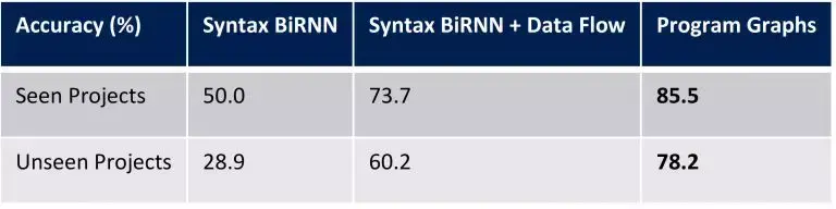 在量更大的定量评估中,这种新方法比传统的机器学习技术要好得多。作为基准测试方法,它考虑到了直接在源代码上工作的双向递归神经网络(BiRNN)以及访问数据流信息的 BiRNN 的简单扩展。为了评估不同的模型,他们分析了总共包含 290 万行源代码的开源 C#项目。在不同的机器学习模型中使用其中单个变量被删除并被要求预测最初使用的变量(假设代码经过充分测试且总是正确的)的源代码进行测试。在第一个实验中,他们用已保存的文件对这些模型进行训练。在第二个实验中,使用全新项目的数据测试这些模型。结果如下表所示,使用新的程序图测试结果更好。image