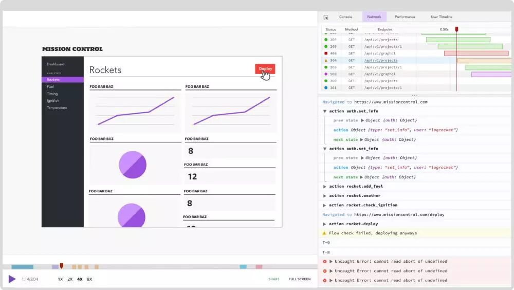除了可以将 Redux 的 action 和 state 记入日志,LogRocket 还可以记录控制台日志,JavaScript 报错,调用栈信息,网络请求、响应头和实体信息,浏览器的元信息和自定义日志。它还利用 DOM 在记录页面上的 HTML 和 CSS,即使是最复杂的单页面应用程序,也可以重新绘制像素级完美的视频。