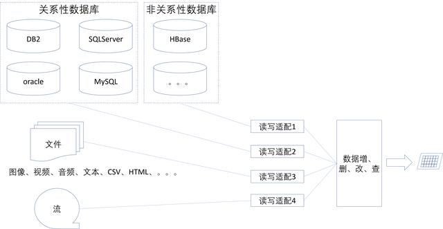 传统的关系型数据库之外,有多种多样的数据源,比如图像、声音、视频等多媒体数据文件或数据流,CSV、TXT、Doc、Excle、PDF、XML 等各种异构数。这些数据都需要做相应的处理,转换成可管理的数据信息。因此在数据架构设计的时候,需要给不同性质的数据源配置相对应的读写适配器,同时也需要有统一调度的地方,如图8所示。全文中架构技术运用到的知识点可以在群619881427免费获取。感兴趣的可以加入进来。