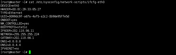 1、修改网络配置文件 [root@master ~]# vi /etc/sysconfig/network-scripts/ifcfg-eth0 配置IP地址、网关、掩码、DNS等,如下所示: 以master为例,其他的从节点配置是一样的步骤,只需要更改对应的IP即可。 DEVICE=eth0