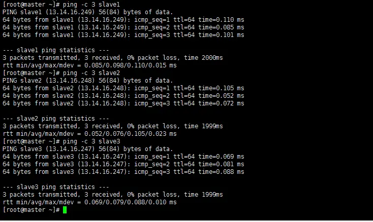 同理,其他从节点上的配置文件内容也是如此,只需要更改对应的IP即可。 2、ping网络进行测试(每台服务器),确定网络可用 [root@master ~]#ping master