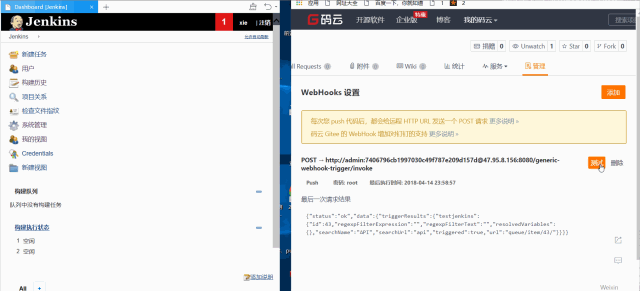 URL格式为 http://<User ID>:<API Token>@<Jenkins IP地址>:端口/generic-webhook-trigger/invokeuserid和api token在jenkins的系统管理-管理用户-admin-设置里,这是我的