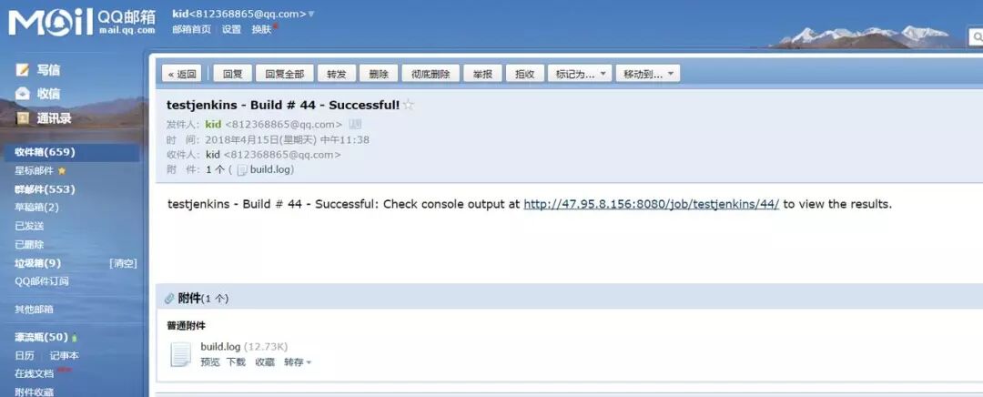 现在当我们在本地修改代码后发出一个git push,Jenkins自动构建部署完成后就会给我发一封邮件,邮件附件里会有本次任务的日志。