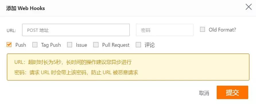 此处以码云为例,因为公司用的是码云,github的配置基本一致,进入码云项目主页后,点击管理-webhooks-添加,会跳出一个这样的框来。