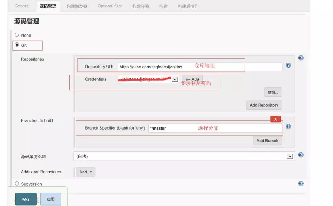 打开刚创建的任务,选择配置,添加远程仓库地址,配置登录名及密码及分支。