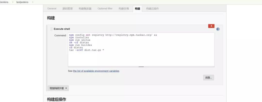 git push触发钩子后,jenkins就要开始工作了,自动化的构建任务可以有很多种,比如说安装升级依赖包,单元测试,e2e测试,压缩静态资源,批量重命名等等,无论是npm script还是webpack,gulp之类的工作流,你之前在本地能做的,在这里同样可以做。