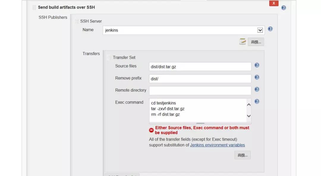 Passphrase:密码(key的密码,没设置就是空) Path to key:key文件(私钥)的路径 Key:将私钥复制到这个框中(path to key和key写一个即可) SSH Servers的配置: SSH Server Name:标识的名字(随便你取什么) Hostname:需要连接ssh的主机名或ip地址(建议ip) Username:用户名 Remote Directory:远程目录(上面第二步建的testjenkins文件夹的路径) 高级配置: Use password authentication, or use a different key:勾选这个可以使用密码登录,不想配ssh的可以用这个先试试 Passphrase / Password:密码登录模式的密码 Port:端口(默认22) Timeout (ms):超时时间(毫秒)默认300000