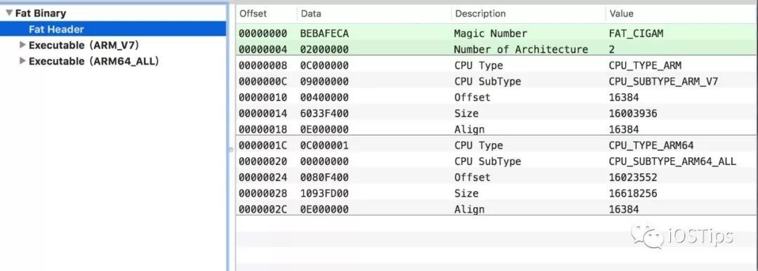 由于历史原因我们APP Architecture设置一般都是arm64,armv7,arm7s,使用MochOView可以查看我们可执行文件支持的架构如图,其实我们的动态库也是Fat Header比如一个30M的MachO ,那么15Mb是64-bit,另外15Mb是32-bit: