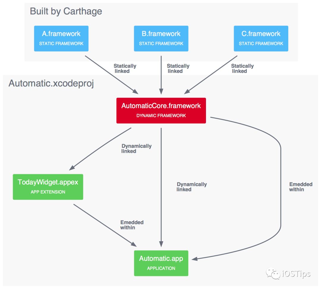 如果我们的app没有APP extension功能建议podfile去掉use_frameworks以静态库引用pod库,这样既可以缩小IPA文件大小又可以优化App启动时间(动态库在pre main前加载耗时在之前的文件有提过),很遗憾我在去掉use_frameworks后重新编译一些Swift三方库报错,暂不支持静态库。这不是重点,如果需要支持APP extension,那么就必须要使用动态库了,这里有国外一位大佬的使用Carthage的方案给我们提供一种思路,大概原理是将多个静态库编为一个动态库,这样在一定程度也可以缩小体积,缩短启动时间。