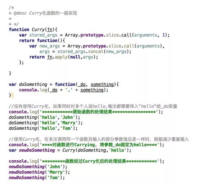 函数doSomething(_do, something),其一开始接收两个参数,先对其进行Currying(先给_do参数传’hello’值),得到一个新的函数newDoSomething(something),此时’hello’值作为一个数据(自由变量),被绑定在newDoSomething(something)这个函数。newDoSomething()可以看成是一个闭包函数:当要执行跟某人说hello这一特定类型的操作时,就可以直接使用newDoSomething(something),来减少了相同参数‘hello’的重复输入。由此可见,在一些应用场景,通过闭包函数来绑定一些固定数据,确实能够给我们带来不少便利。