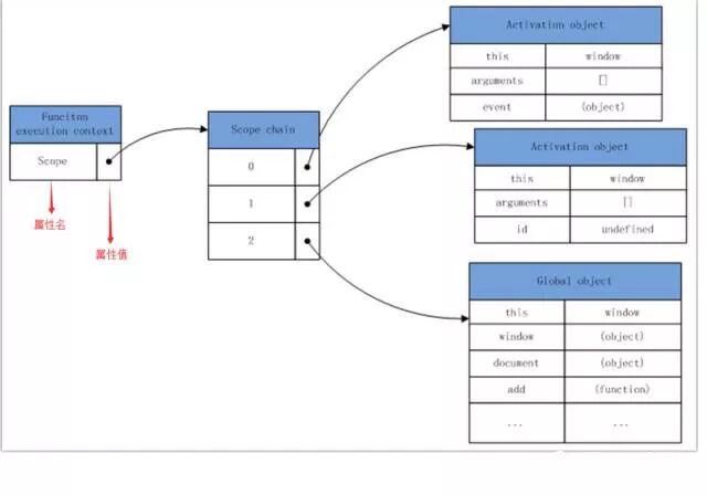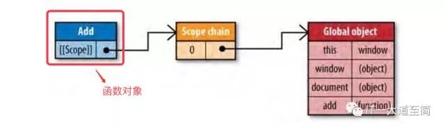 该函数对象有个scope属性,这个scope属性维护着一条作用域链(scope chain),作用域链上的每个节点,都是一个活动对象(activation object, 下面会介绍)。函数对象的scope属性的初始值,赋值自当前函数对象的父级作用域的执行上下文对象(execution context, 下面会介绍)的scope属性值。