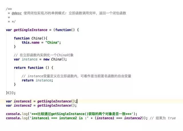 在代码中,我们定义了一个立即函数,在立即函数内部定义了一个instance变量,其值是China构造函数的实例对象;在匿名函数内部,使用了instance变量,所以instance可以看作是匿名函数的自由变量;立即函数执行完毕时,其返回值匿名函数会被立即函数所在的作用域的getSingleInstance变量所引用,则意味着闭包函数的创建成功。此时,虽然立即函数已经执行完毕,但是其定义的内部变量instance(绑定在了闭包函数的作用域链上),因为闭包函数对象不被回收而得到了保留。又因为instance变量是定义在立即函数内部的私有变量,所以仅能通过闭包函数访问之,而无其它访问入口。闭包函数这种既能保留变量又能给变量提供访问控制的特性,应用到单例模式的实现,可谓是再适合不过。