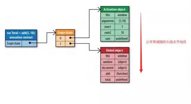 一个函数在执行时,当要读取某个变量,JS变量查找机制,会从当前函数对应的执行上下文对象的作用域链的头结点(索引下标为0)开始搜索,如果找到匹配的变量,则返回其值;如果未找到匹配的变量,则继续搜索scope chain中的下一个活动对象结点,直到找到为止;如果搜索完执行上下文对象的整条scope chain仍未找到匹配变量,则返回undefined。