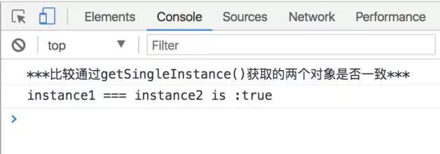 从控制台的输出结果,可知我们利用闭包函数成功实现了一个饿汉式(非延迟实例)的JS单例模式。