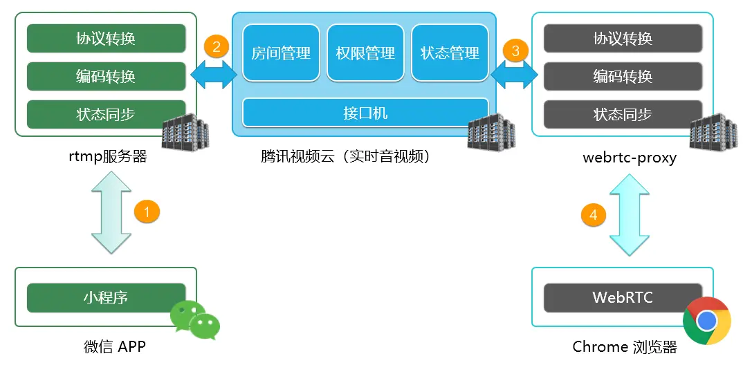 (3)再次,实时音视频后台会再次将数据交给一个叫做 WebRTC-Proxy 的模块,就在这里, WebRTC-Proxy 要将来自小程序音视频的音视频数据翻译成 WebRTC 理解的“语言”。