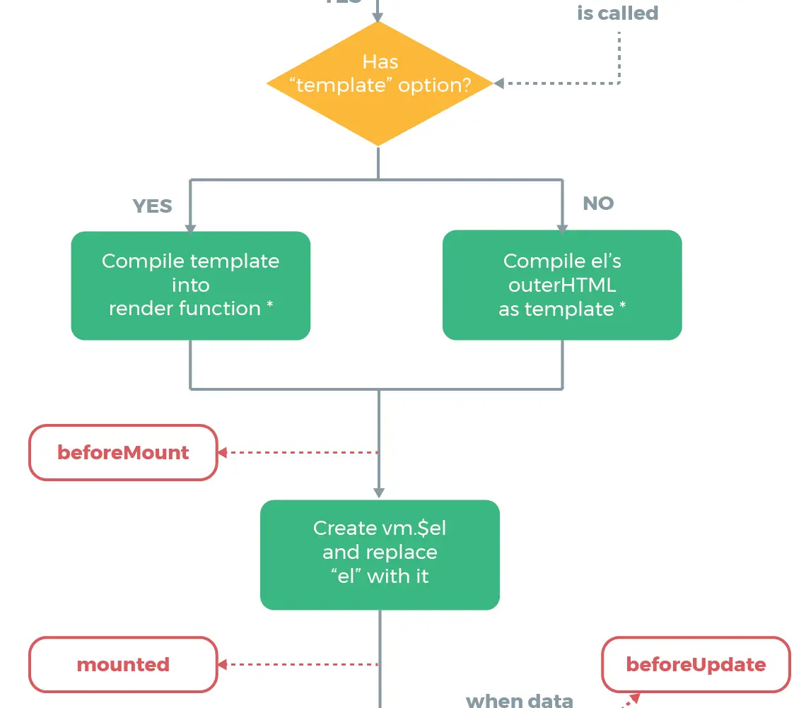 如果render function存在,则直接调用beforeMount生命周期钩子函数,如果不存在,则通过createEmptyVNodeCompile template into render function Or compile el's outerHTML as template。