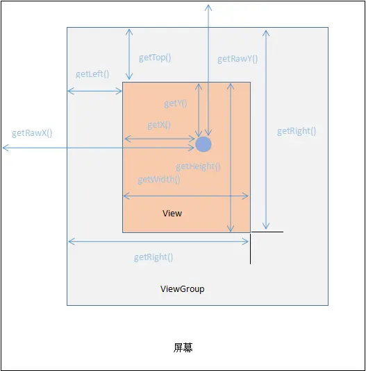 这里getX()、getY()获取到的就是视图坐标的坐标点,getRawX()、getRawY()获取到的就是Android坐标的坐标点。结合上图和这些相关的事件,很轻易就可以理解这两种坐标了。