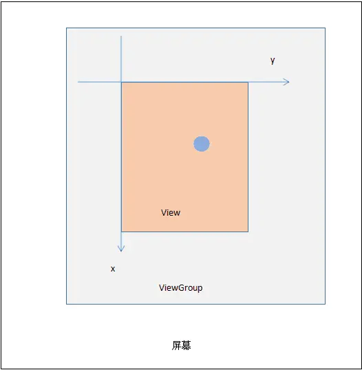 b、视图坐标:视图坐标和Android坐标相似,也是从原点水平向右代表x正方向,垂直向下代表y正方向,但是原点不再是屏幕的坐上角,而是父View的左上角作为原点,如下图所示。