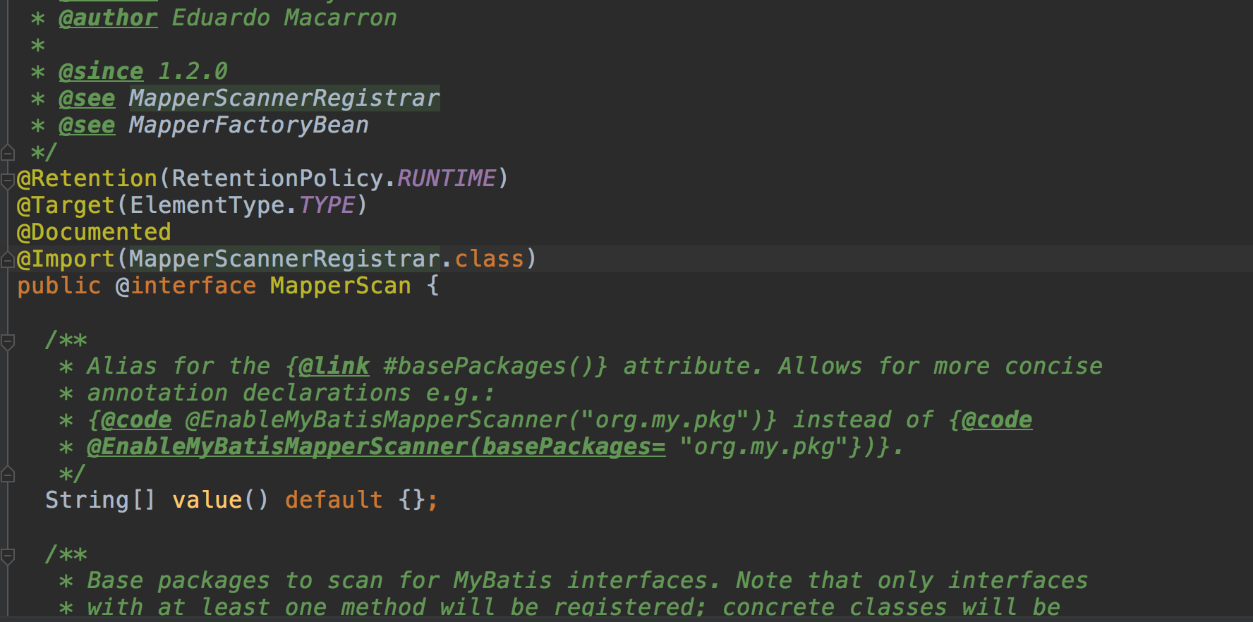 从图上可以看出这个@MapperScan注解是一个复合注解,它同时拥有了@Import(MapperSannerRegistrar), 这个是扫描非常重要的类。
