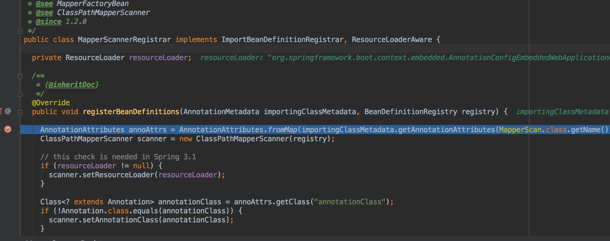 从图中最后三行分别是在初始化注入Mapper接口类全名,设置注入spring容器的中BeanDefinition的实际BeanClass是MapperFacotyBean这个类,设置MapperFactoryBean实例对象addToConfig的值为true,