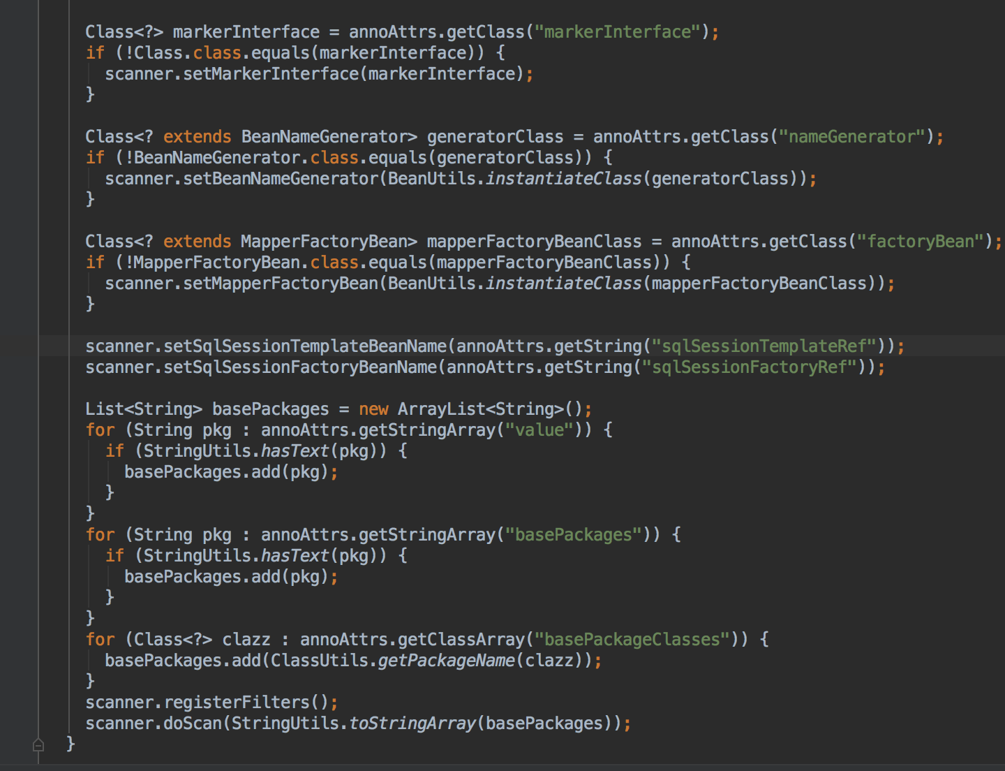这个方法主要是用ClassPathMapperScanner这个类去扫描路径然后注入到Spring的容器中,前面主要在设置scan的属性,重点看一最后两行scan.registerFilter和scan.doScan.