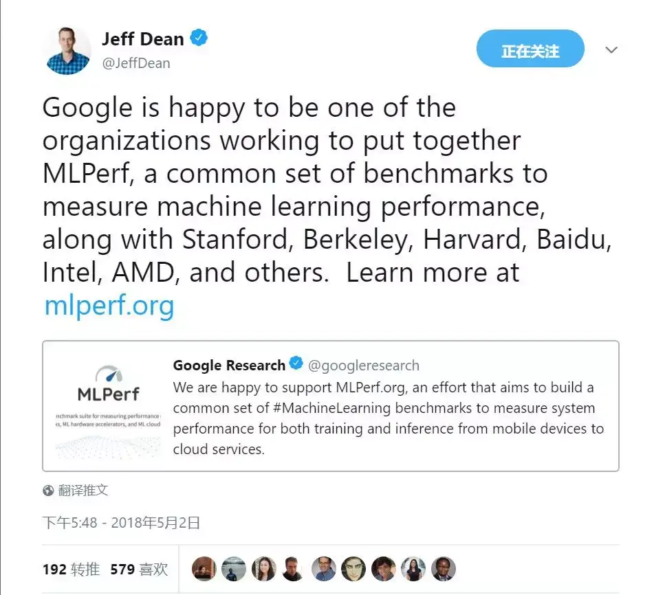 大意:谷歌很高兴和斯坦福、伯克利、哈佛、百度、英特尔、AMD 等等企业一起,成为致力于将 MLPerf 作为衡量机器学习性能的通用标准的组织之一。