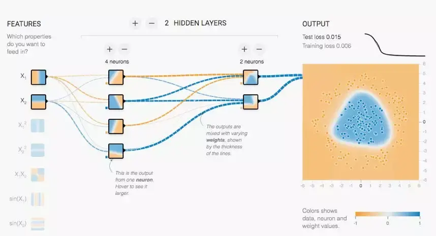 如上图所示,右边区域是我们的问题,黄色区域里面有很多的点是我们所收集到的数据,背景色是我们找到的解。这幅图展现的就是通过浅层学习找到了问题的解。但是浅层学习有一个巨大的缺点就是特征需要人工提前做抽取和处理。