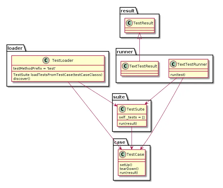 Process梳理: 完成TestCase内容,由TestLoadFrom将其加载到TestSuite中,然后TestRunner测试输出结果到TestResult