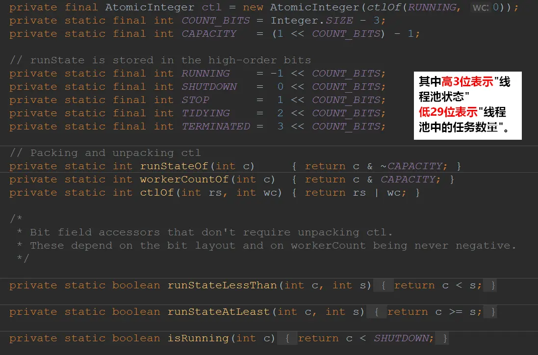 变量ctl定义为AtomicInteger,记录了“线程池中的任务数量”和“线程池的状态”两个信息。
