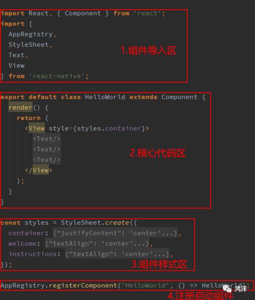 1)组件导入区: 所有用到的组件都需要事先进行导入,包括样式也需要进行导入2)核心代码区:所有逻辑代码编写的地方3)组件样式区:render()方法中用到的组件的样式,可以集中在这里编写4)注册启动组件:组件只有注册后才能运行。这里用到的AppRegistry也需要在组件导入区进行导入