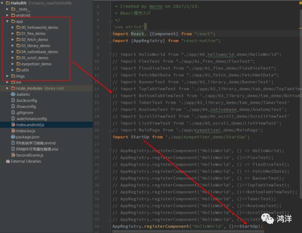 是不是我们编写每一个知识点的demo都要通过 【react-native init XXXX】的方式去新建一个项目呢?当然不是,我们可以把所有代码都写到一个demo里,并通过分包进行管理(app的文件夹是自己创建的,名字自定),这样自己看起来也比较方便。然后每个demo都通过import的方式导入到index.android/ios.js文件中进行使用。
