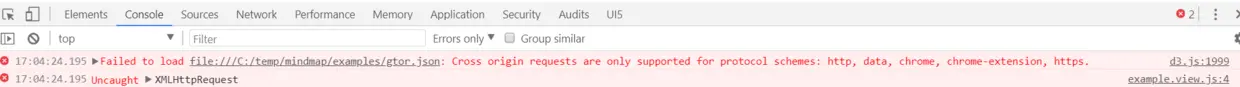 如果直接双击examples文件夹里的index.html文件在浏览器里打开,会出现跨域错误导致本地文件gtor.json无法访问: