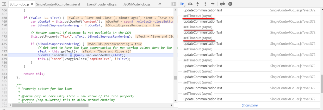 一秒钟之后,断点会自动触发,停留在该元素的innerHTML发生变化的代码位置。从代码478我们得知,UI上按钮的文字能够刷新,是因为其dom元素的innerHTML属性被修改的缘故。