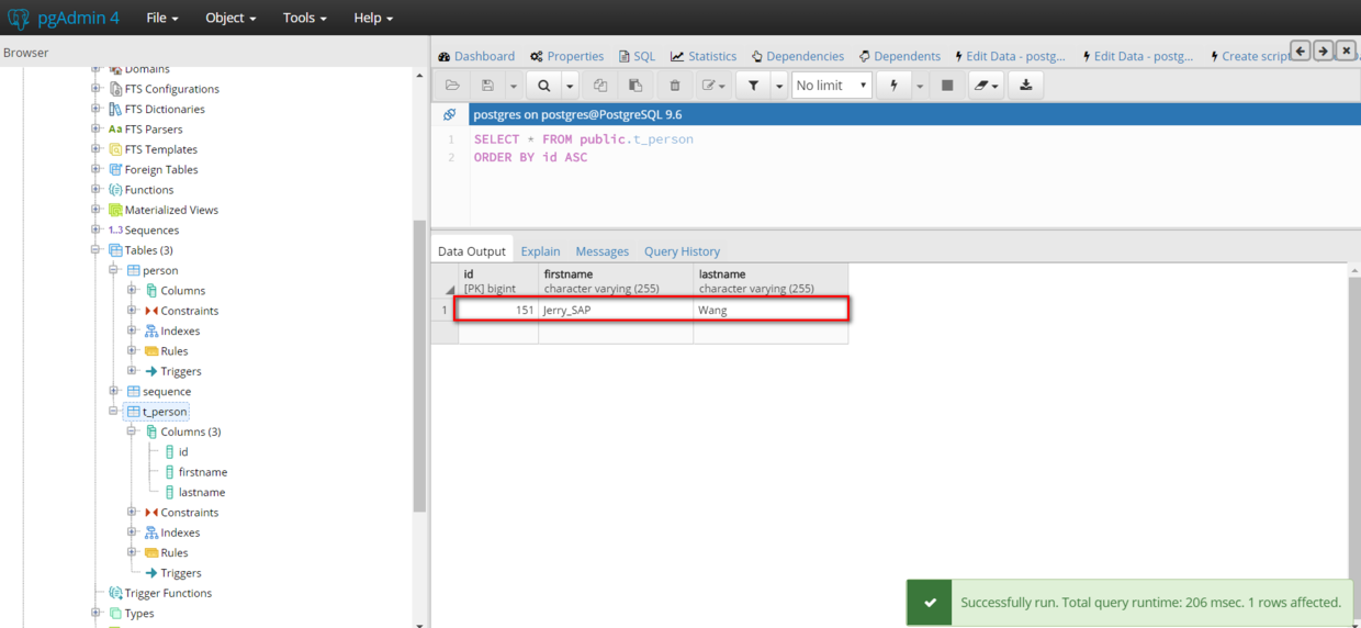 成功执行后,在PostgreSQL的Admin UI上能看到测试Java程序里用JPA插入数据库的记录: