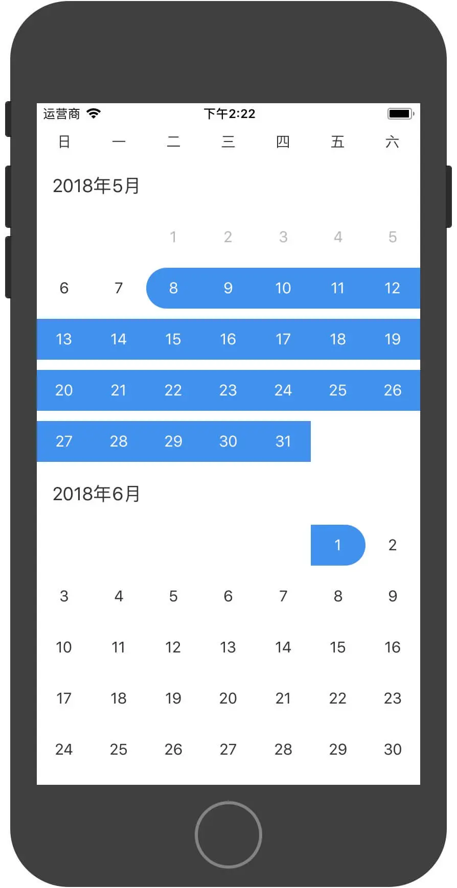 - 最后,我们可以用renderDay来渲染每个日期的信息。需要注意的是,每个Day可能有5种不同的状态(NONE, SINGLE_CHOSEN, RANGE_BEGIN_CHOSEN, RANGE_MIDDLE_CHOSEN, RANGE_END_CHOSEN),所以需要不同的相应样式来对应。