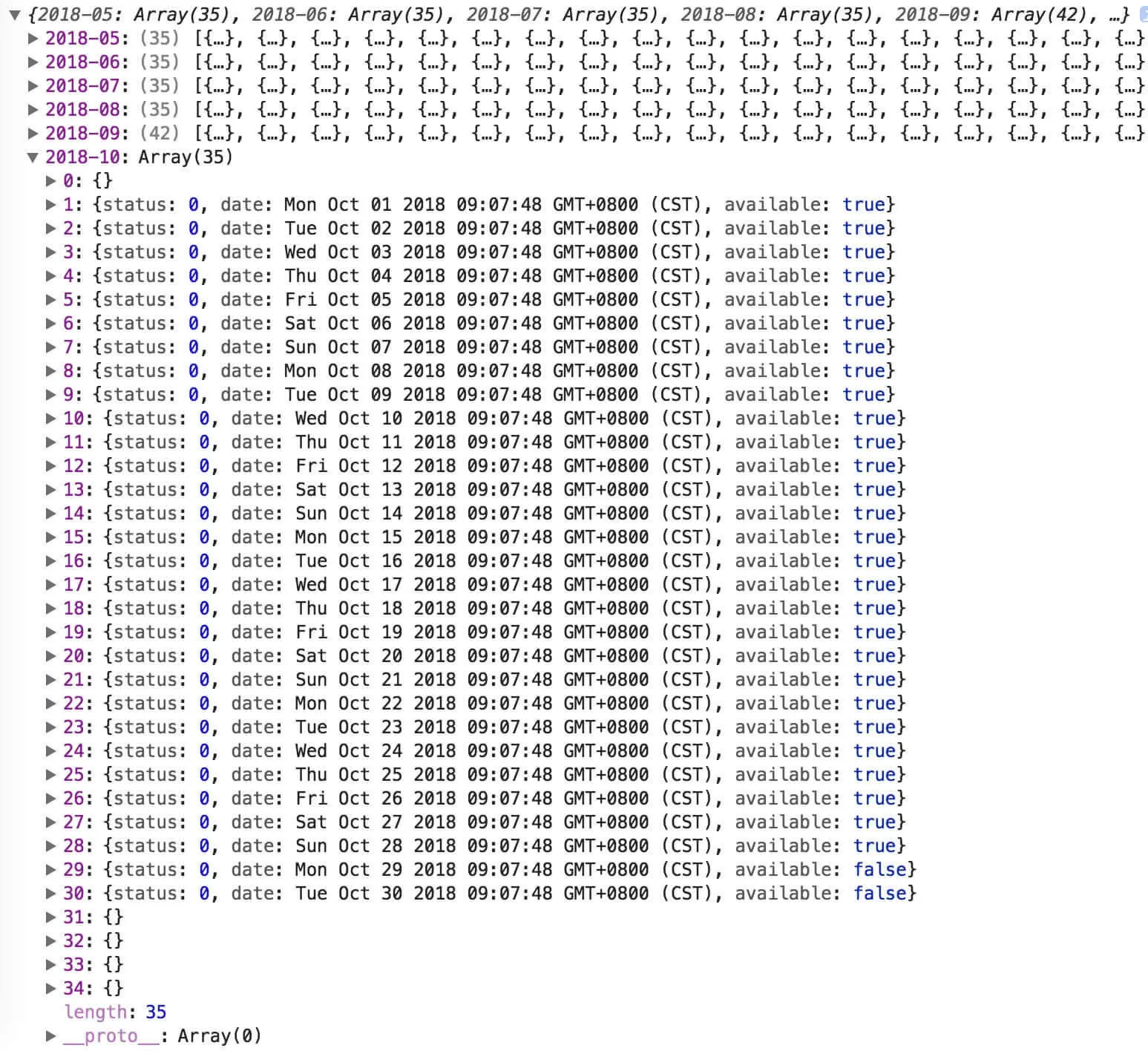 - 再来看day的数据结构,我们可以先给它定义几个基础属性:date、available、status。其中,status代表该日期当前的状态,主要是用以区分用户在拖拽操作日历时,有没有选中该日期。