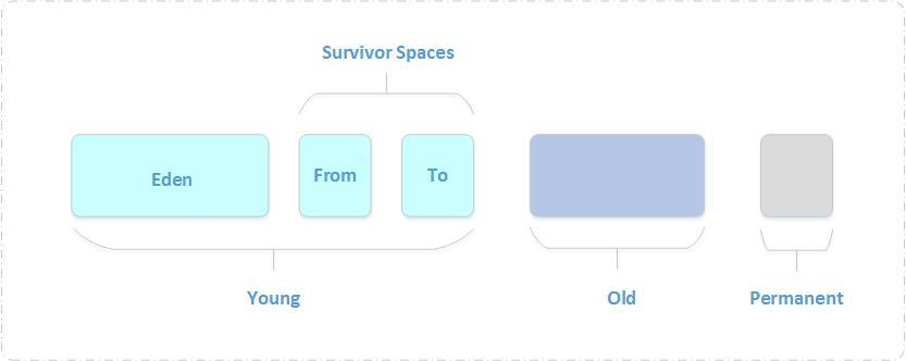 Java 虚拟机将堆内存划分为 新生代、老年代和永久代 ,永久代是 HotSpot 虚拟机特有的概念(JDK1.8 之后为 metaspace 替代永久代),它采用永久代的方式来实现方法区,其他的虚拟机实现没有这一概念,而且 HotSpot 也有取消永久代的趋势,在 JDK 1.7 中 HotSpot 已经开始了“去永久化”,把原本放在永久代的字符串常量池移出。永久代主要存放常量、类信息、静态变量等数据,与垃圾回收关系不大,新生代和老年代是垃圾回收的主要区域。 内存简图如下: