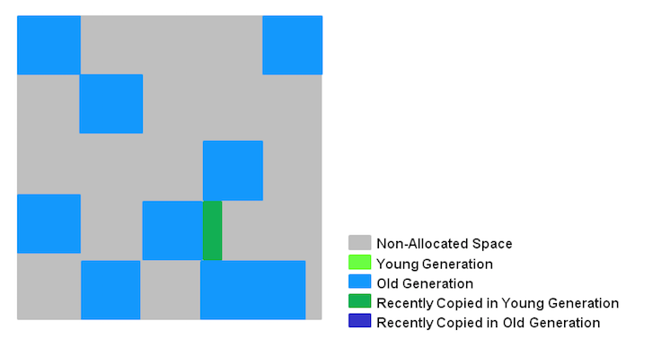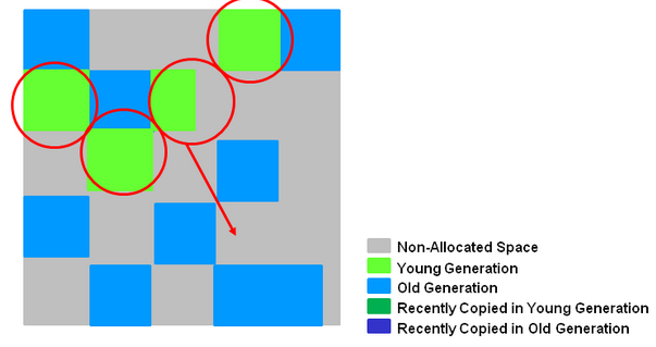 此算法把内存空间划为两个相等的区域,每次只使用其中一个区域。垃圾回收时,遍历当前使用区域,把正在使用中的对象复制到另外一个区域中。此算法每次只处理正在使用中的对象,因此复制成本比较小,同时复制过去以后还能进行相应的内存整理,不会出现“碎片”问题。当然,此算法的缺点也是很明显的,就是需要两倍内存空间。简图如下: