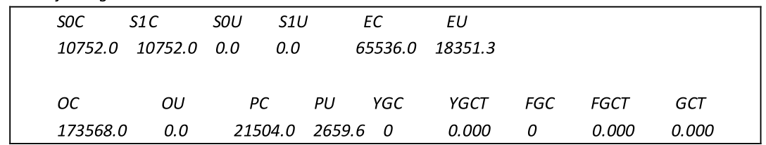 SXC - survivor 初始空间大小,单位字节。 SXU - survivor 使用空间大小, 单位字节。 EC - eden 初始空间大小 EU - eden 使用空间大小 OC - old 初始空间大小 OU - old 使用空间大小 PC - permanent 初始空间大小 PU - permanent 使用空间大小 YGC - youngGC 收集次数 YGCT - youngGC 收集使用时长, 单位秒 FGC - fullGC 收集次数 FGCT - fullGC 收集使用时长 GCT - 总计收集使用总时长 YGCT+FGCT